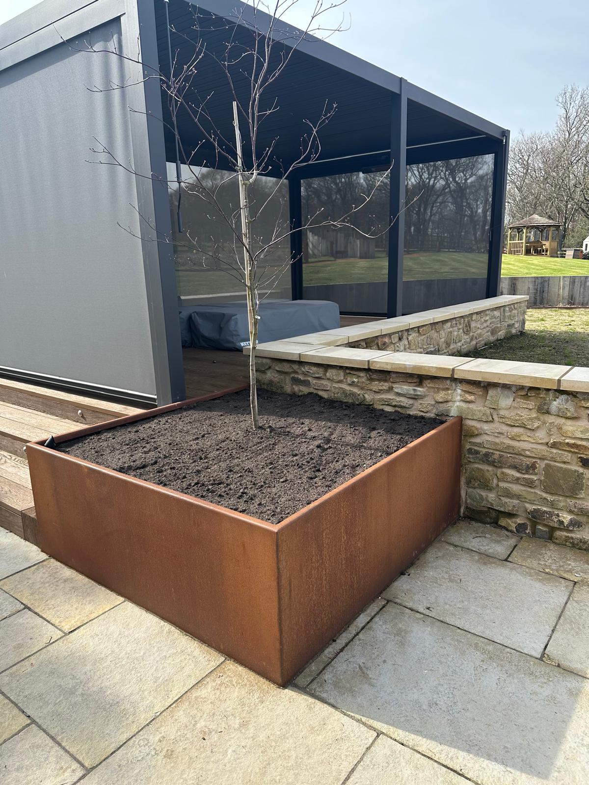 Bespoke Cor-Ten® Steel planter fabricated by Metal Solutions delivering a cohesive architectural statement to this garden through precision detailing, durability, and a timeless weathered finish that pairs perfectly with the surrounding stone.
