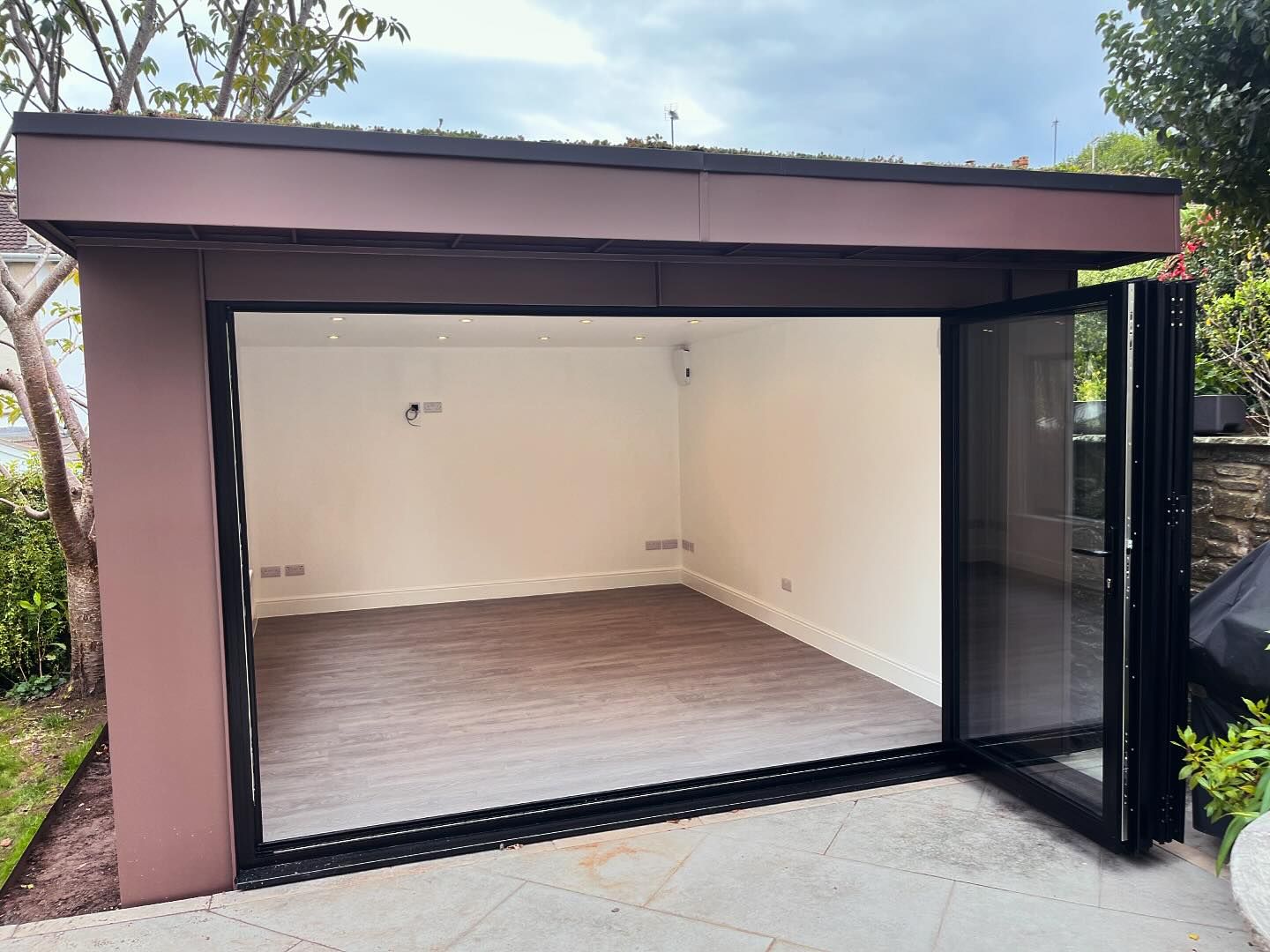 Profile Roofing and Cladding have partnered with Landpoint Custom Garden Rooms to create this lovely garden office. A great choice of natural metal cladding sits nicely with the roofs in the surrounding area. This NedZink Nuance Brown is complemented by the black trim and bifold doors. It is a lovely neat standing seam install and comes with all the high specification features.