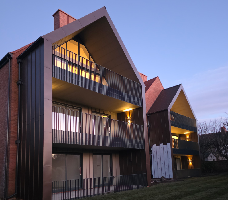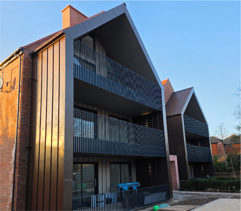This project completed by the talented team at Merseyside Zinc features 4 gable balconies finished in NedZink Nuance Brown. The use of Nuance Brown has given the build a contemporary yet warm finish that compliments the surroundings perfectly.