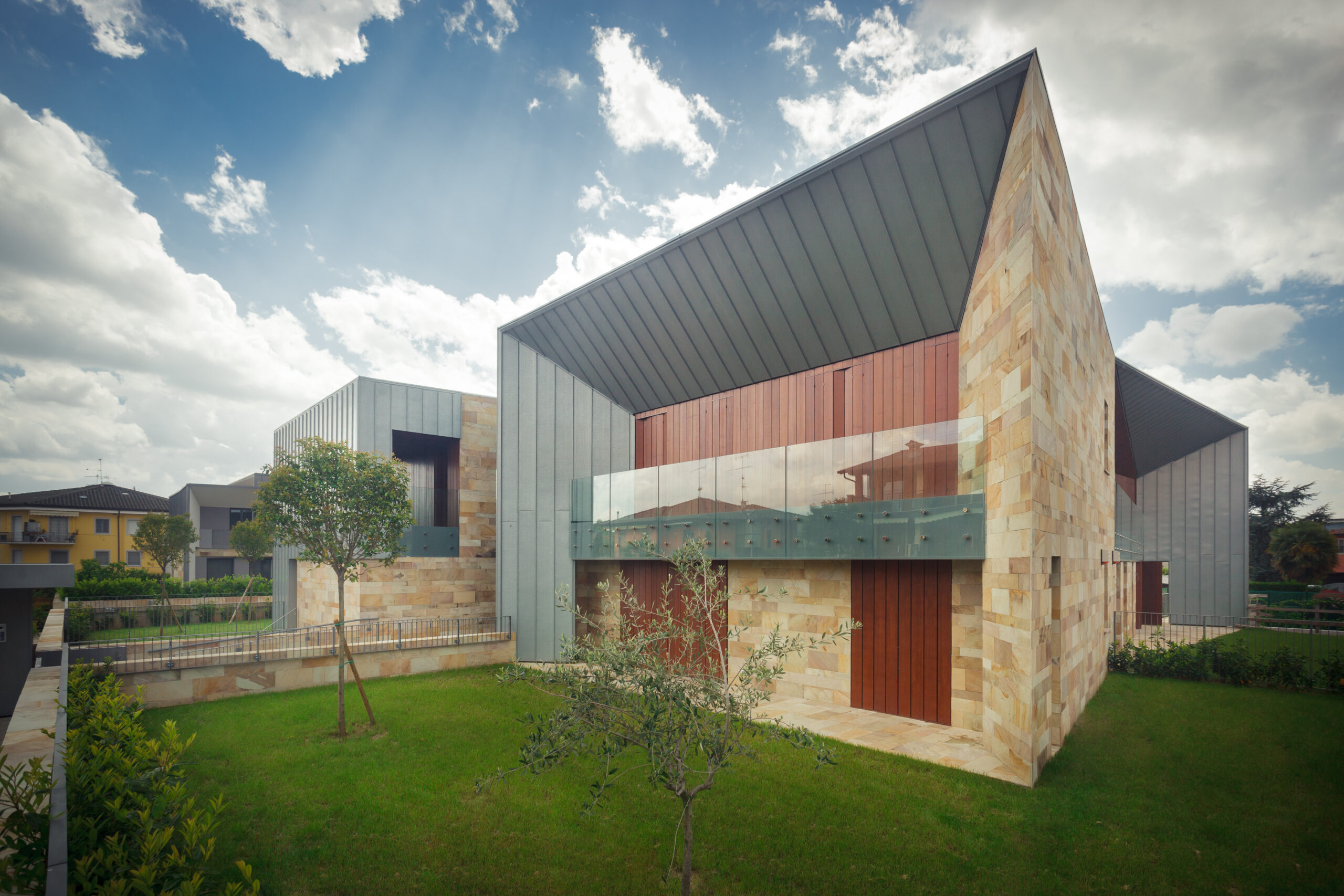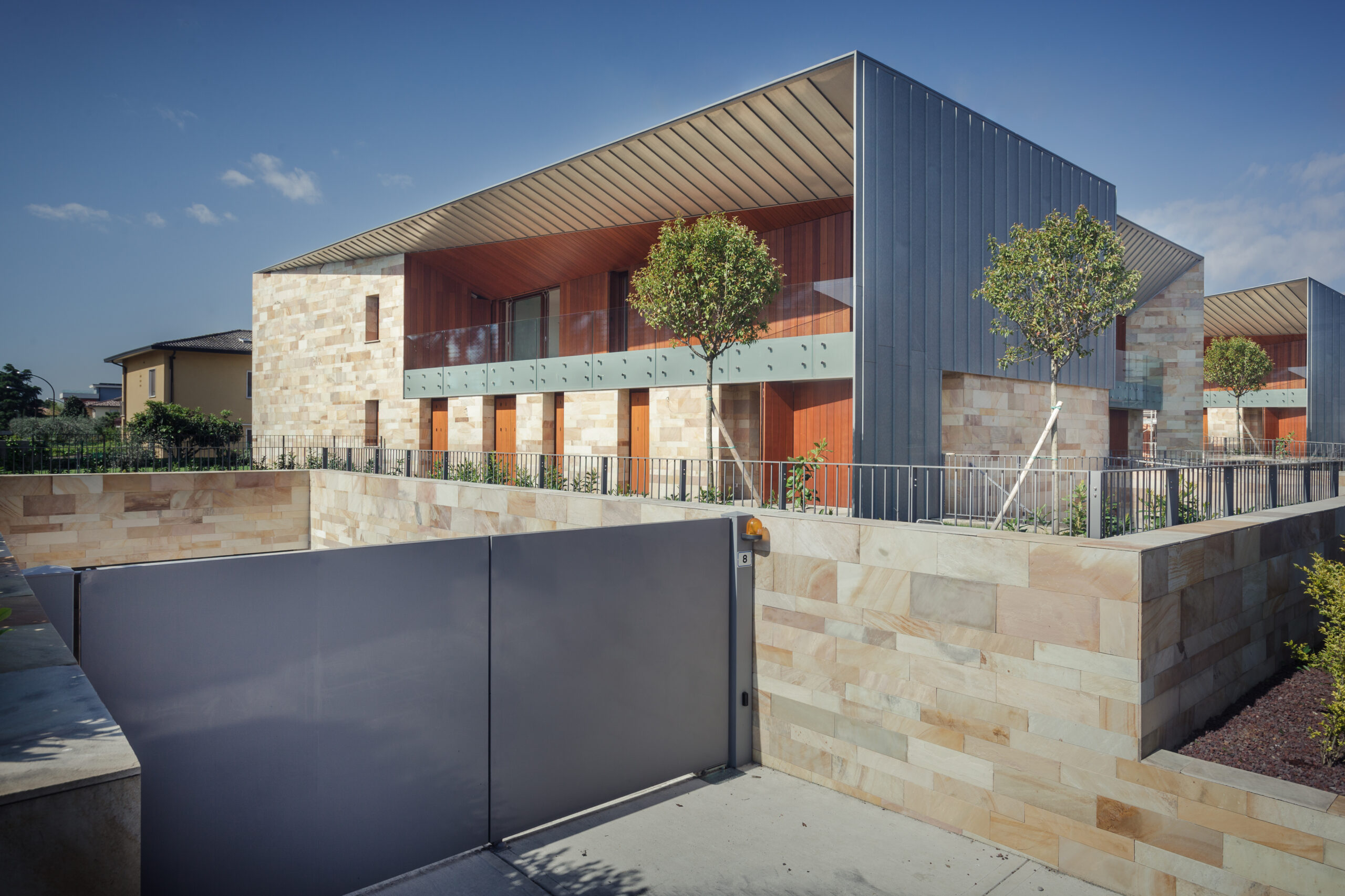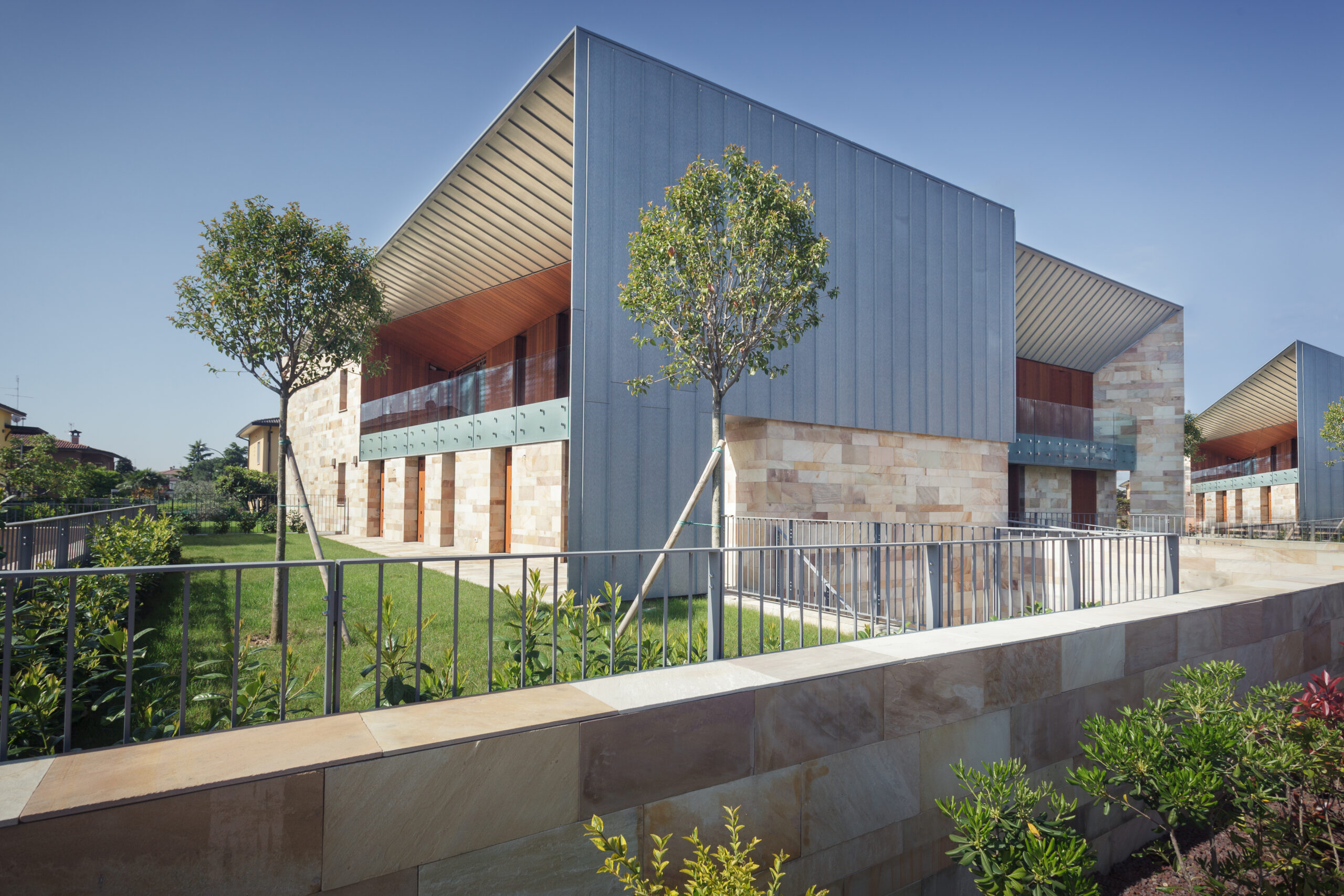 Ville Aimaro complex was designed by Giovanni Cenna Architettura. The design is not limited to the living space but extends to the full complex. The outdoor environments were designed to be experienced as part of the residence and to integrate with the surrounding nature. This concept guided the selection of materials: wood and stone for the horizontal and vertical surfaces, crystal for the parapets, rolled titanium zinc product for its elegant detailing.