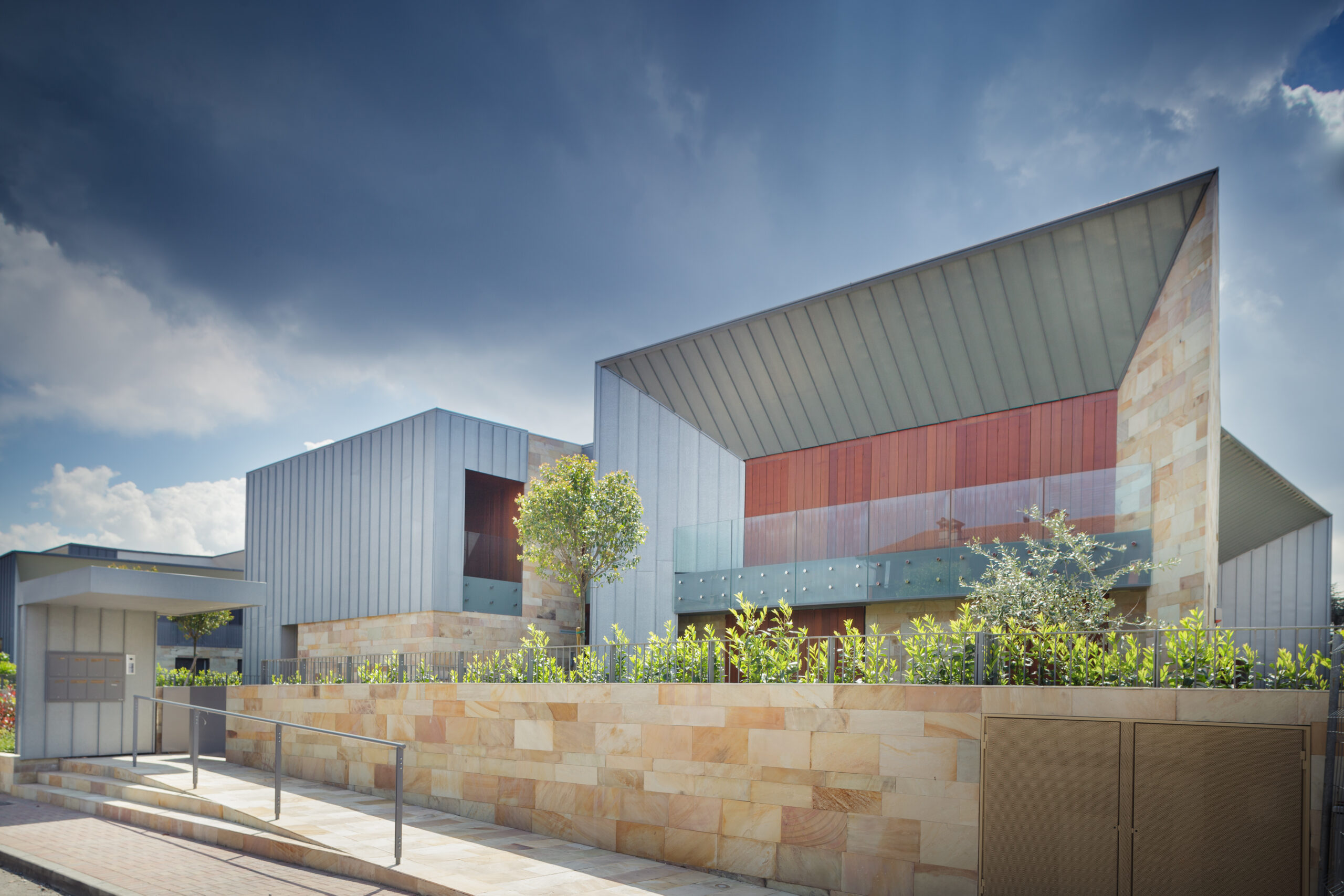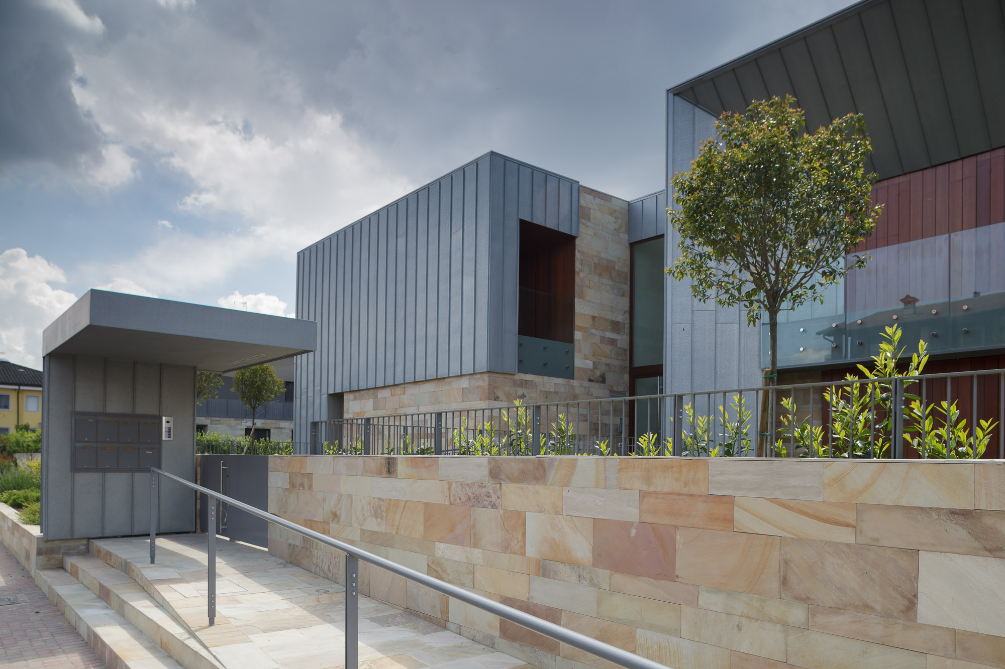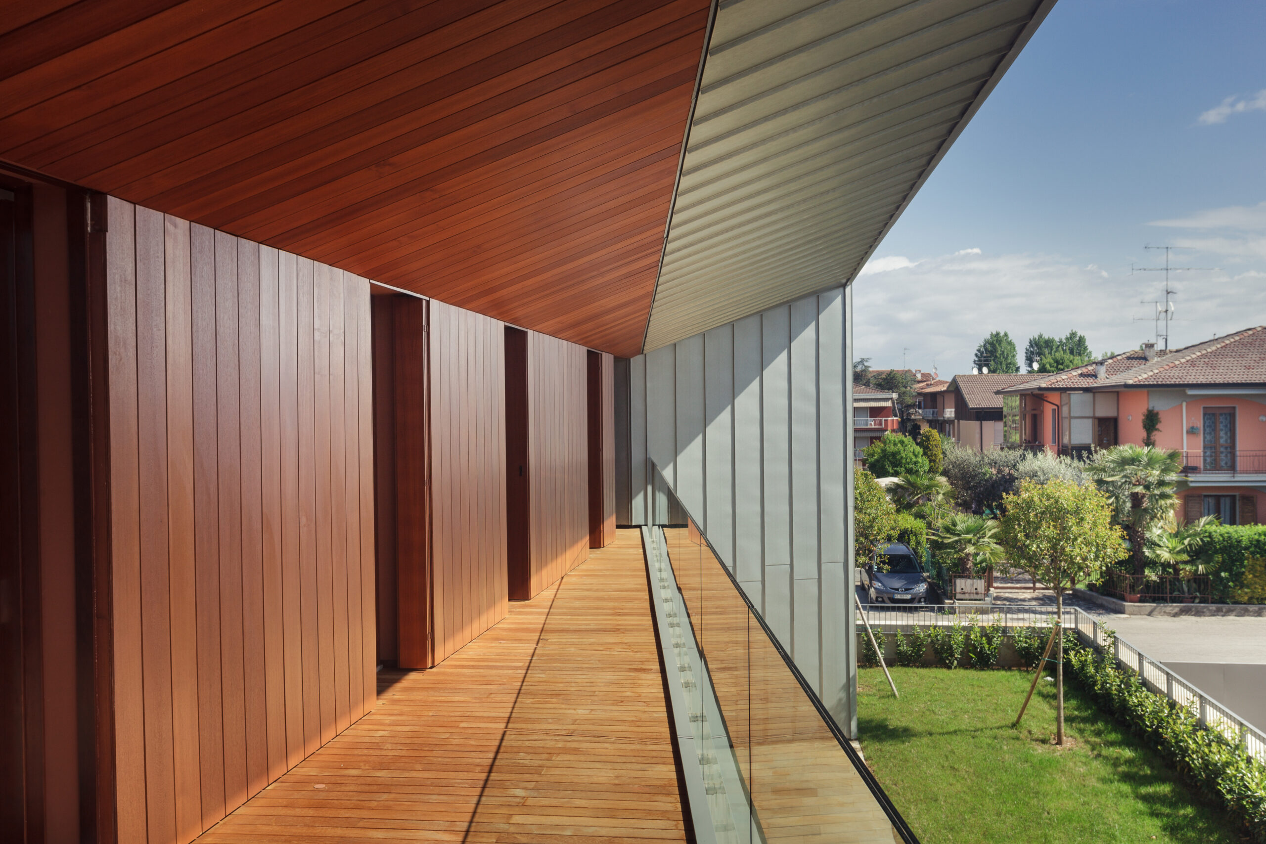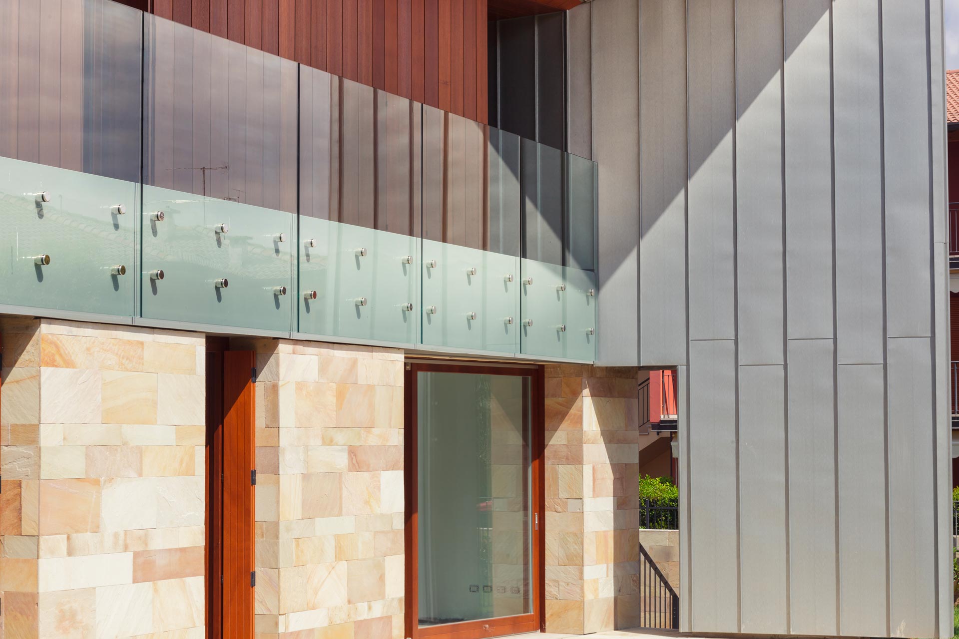 Ville Aimaro complex was designed by Giovanni Cenna Architettura. The design is not limited to the living space but extends to the full complex. The outdoor environments were designed to be experienced as part of the residence and to integrate with the surrounding nature. This concept guided the selection of materials: wood and stone for the horizontal and vertical surfaces, crystal for the parapets, rolled titanium zinc product for its elegant detailing.